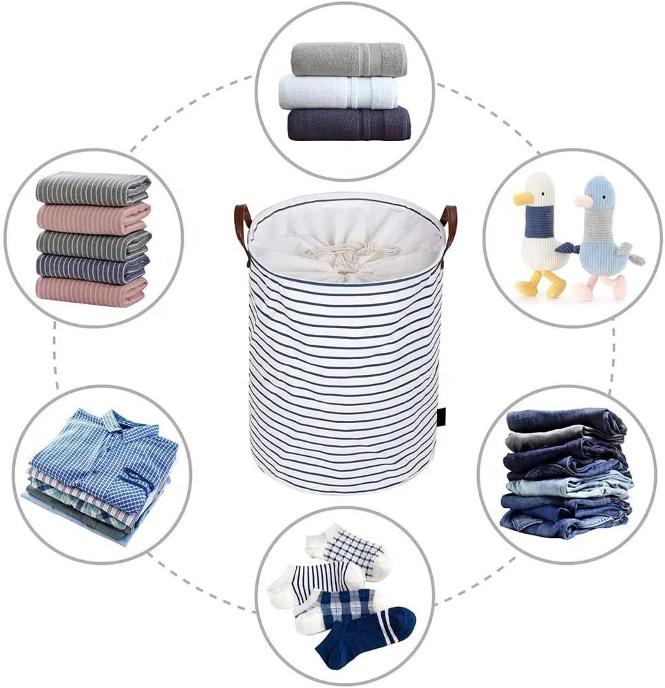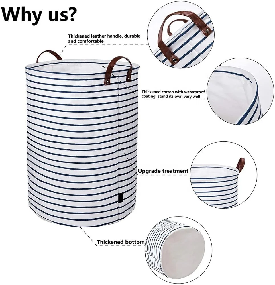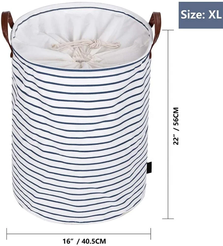 Blue Strips Laundry Basket with Durable Leather Handles Drawstring Waterproof Round Cotton Linen Collapsible Storage Basket