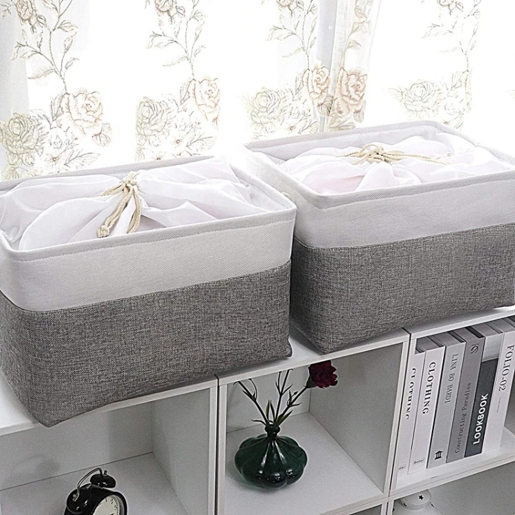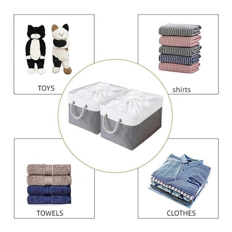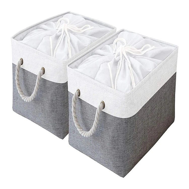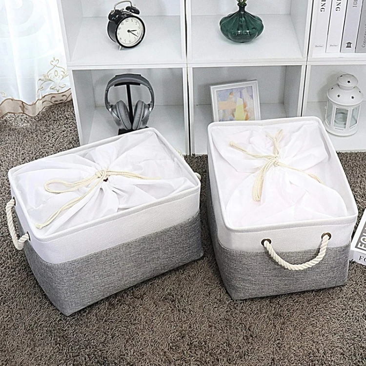 Collapsible Storage Basket Cotton Linen Fabric Storage Bin with Cotton Rope Baskets for Organizing With Inner Pocket