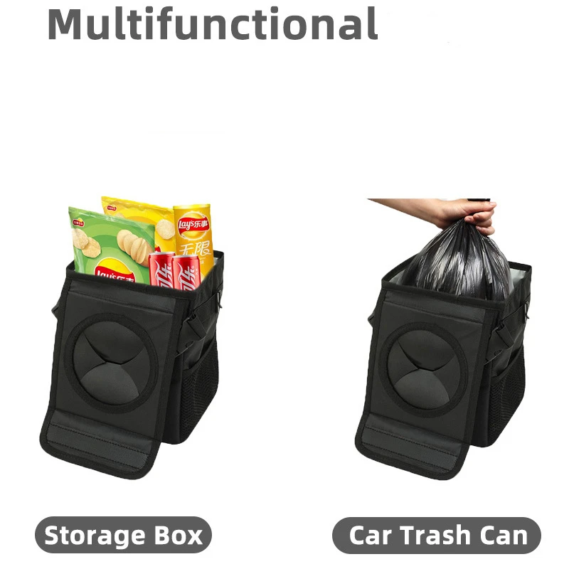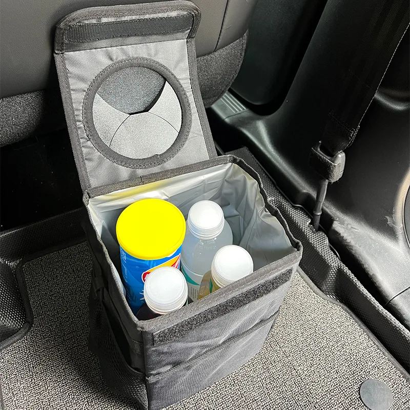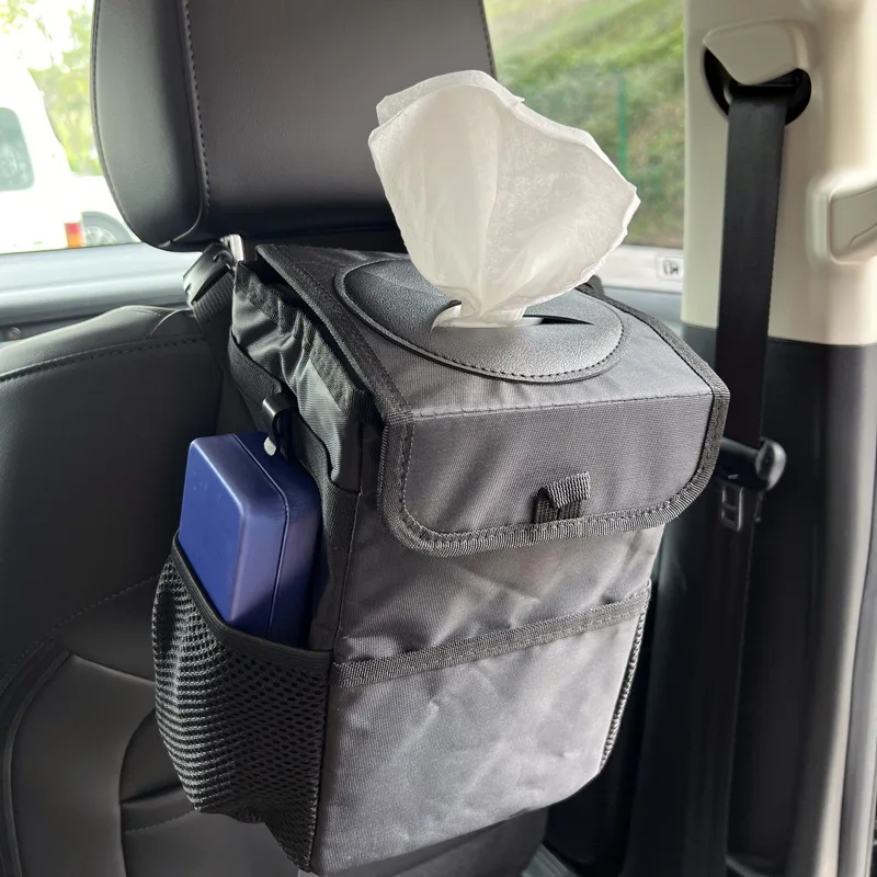 Multipurpose trash can hanging behind the car seat slot