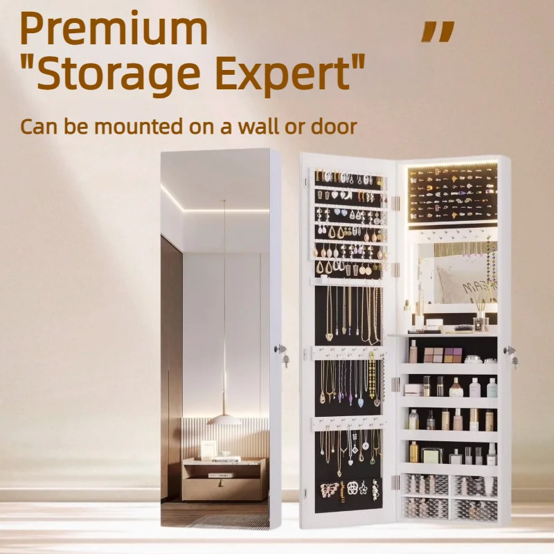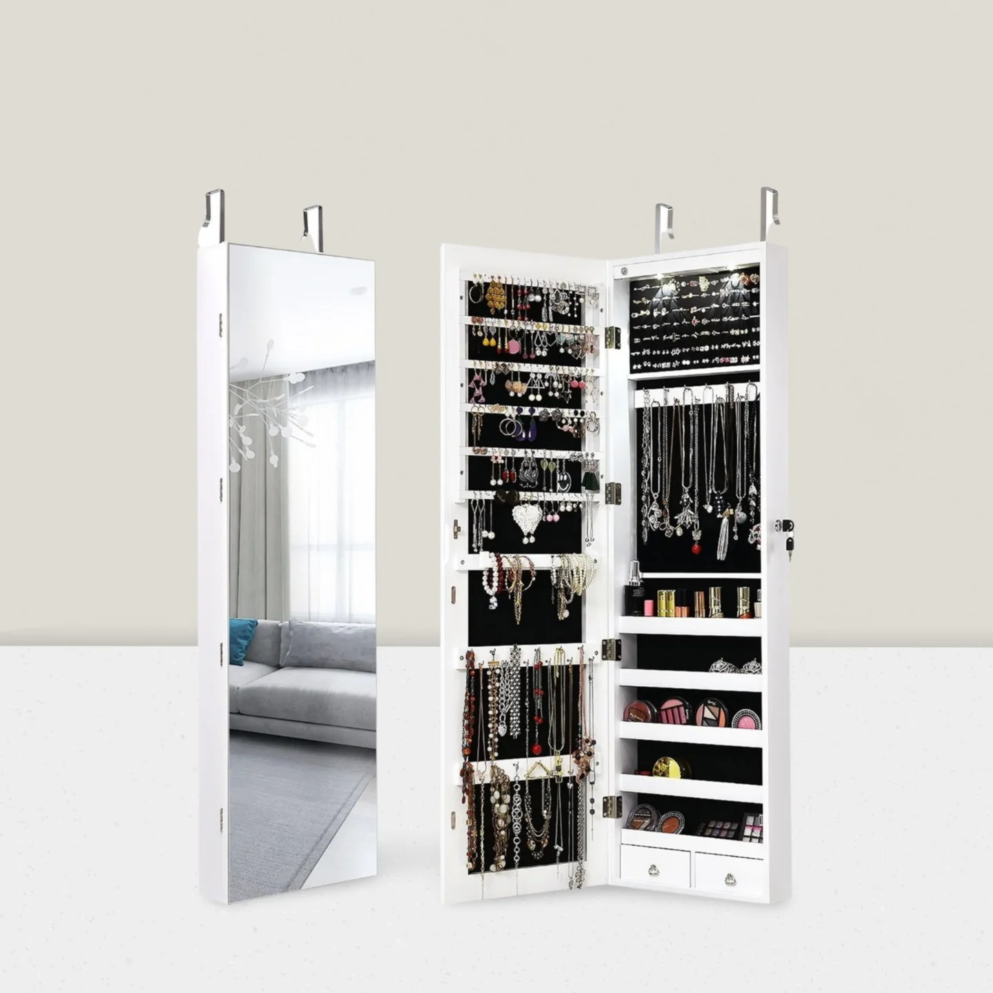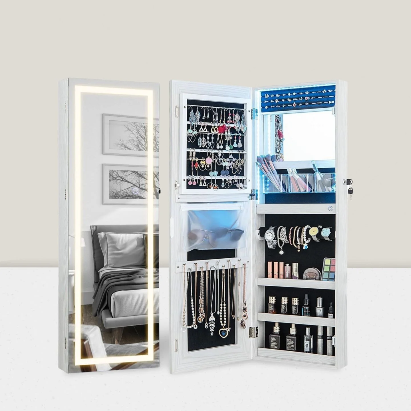 Jewelry Armoire Wall Mounted Over The Door Hanging Jewelry Organizer Storage with Lights Lockable White