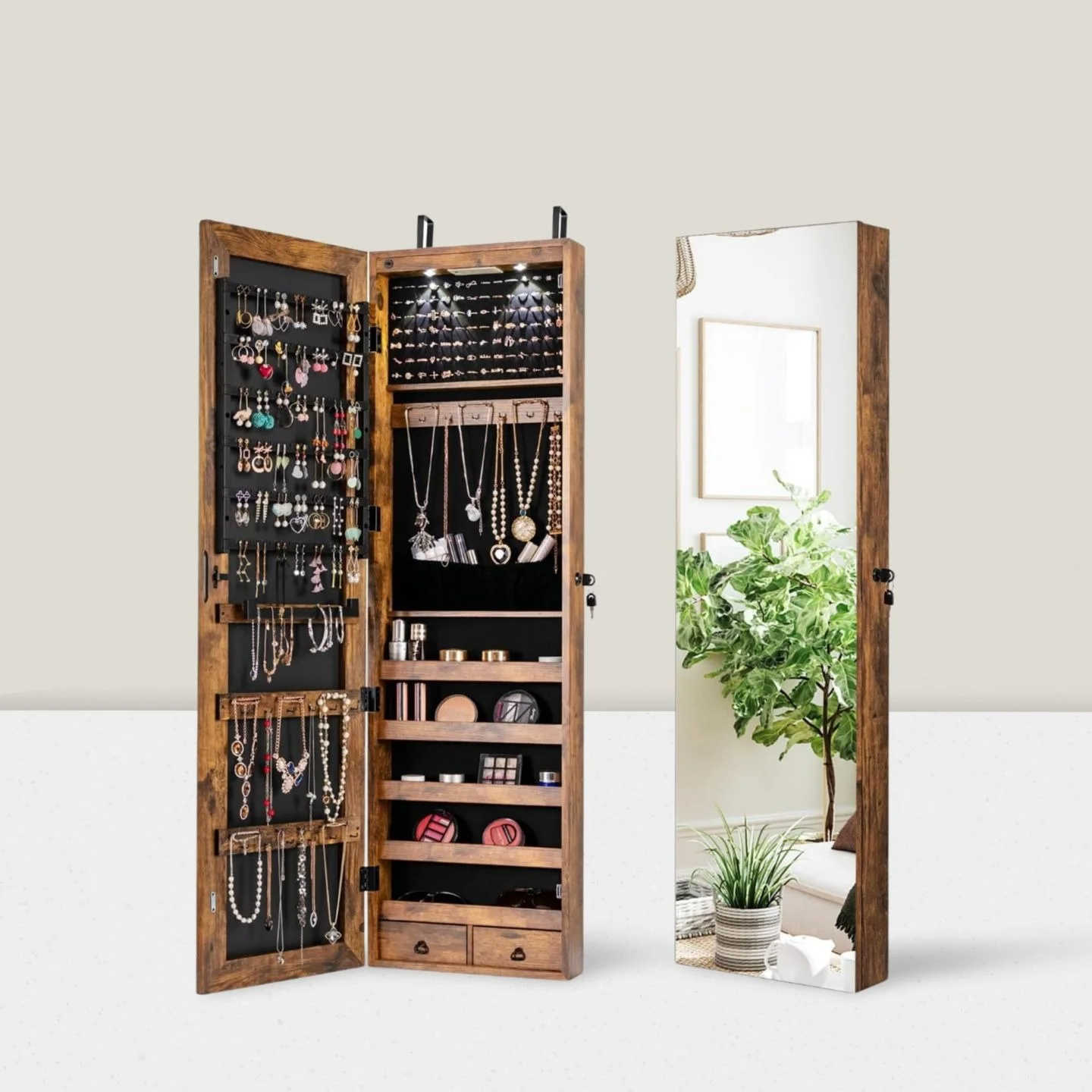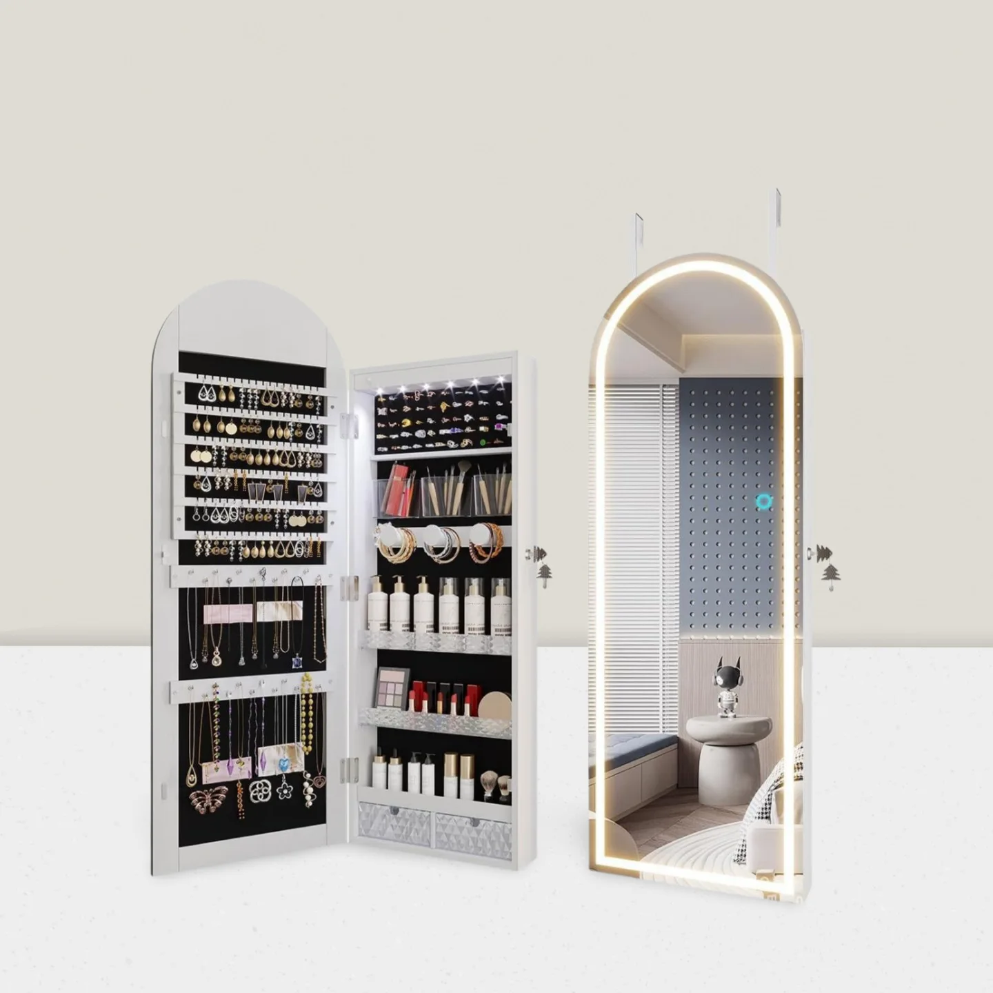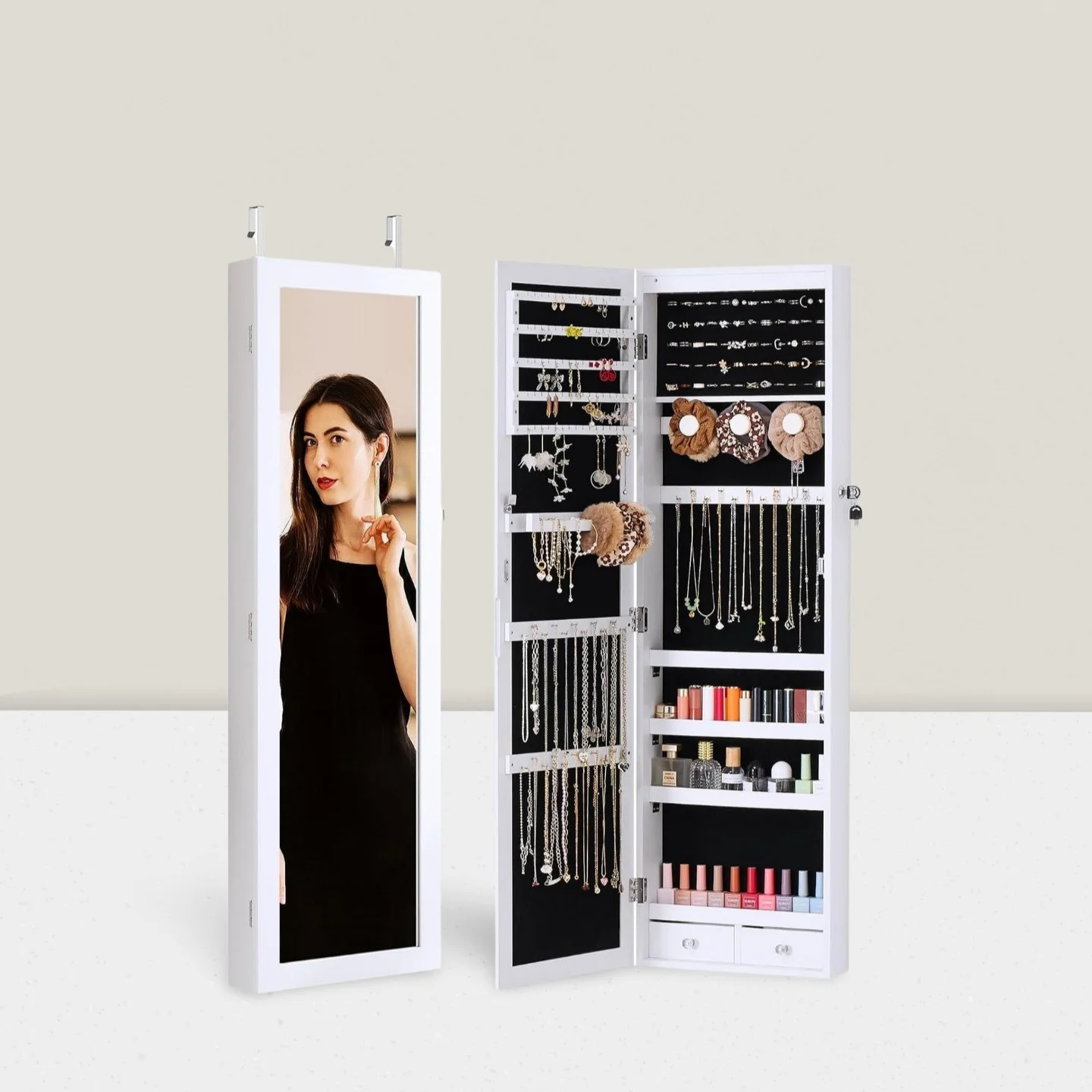 Jewelry Armoire Wall Mounted Over The Door Hanging Jewelry Organizer Storage with Lights Lockable White